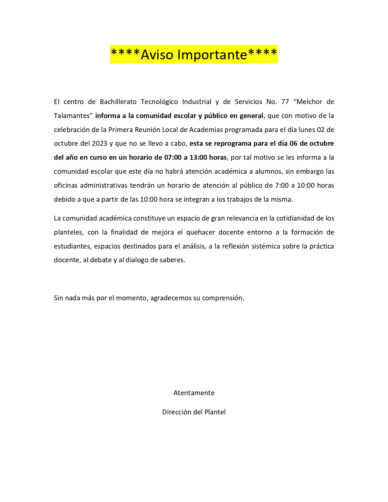 El centro de Bachillerato Tecnológico Industrial y de Servicios No. 77 “Melchor de Talamantes” informa a la comunidad escolar y público en general, que con motivo de la celebración de la Primera Reunión Local de Academias para el día 06 de octubre del año en curso en un horario de 07:00 a 13:00 horas, se suspende la atención academica el día 06 de octubre del 2023