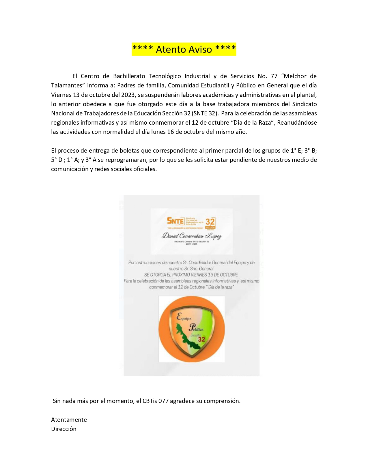 El Centro de Bachillerato Tecnológico Industrial y de Servicios No. 77 “Melchor de Talamantes” informa a: Padres de familia, Comunidad Estudiantil y Público en General que el día Viernes 13 de octubre del 2023, se suspenderán labores académicas y administrativas en el plantel, otorgado este día a la base trabajadora miembros del Sindicato Nacional de Trabajadores de la Educación Sección 32 (SNTE 32)