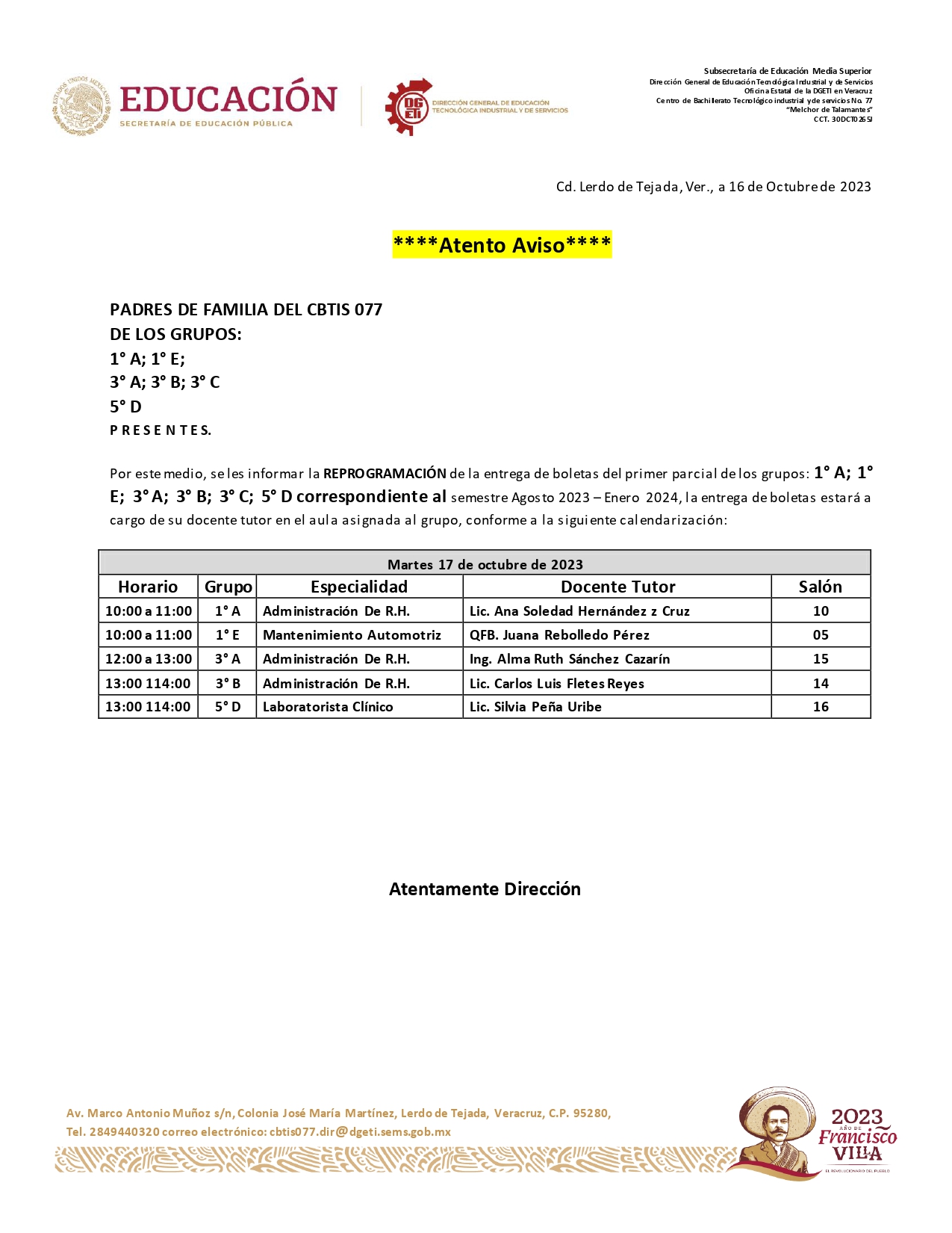 Por este medio, se les informar la REPROGRAMACIÓN de la entrega de boletas del primer parcial de los grupos: 1° A; 1° E; 3° A; 3° B; 5° D correspondiente al semestre Agosto 2023 – Enero 2024, la entrega de boletas estará a cargo de su docente tutor en el aula asignada al grupo, conforme a la siguiente calendarización