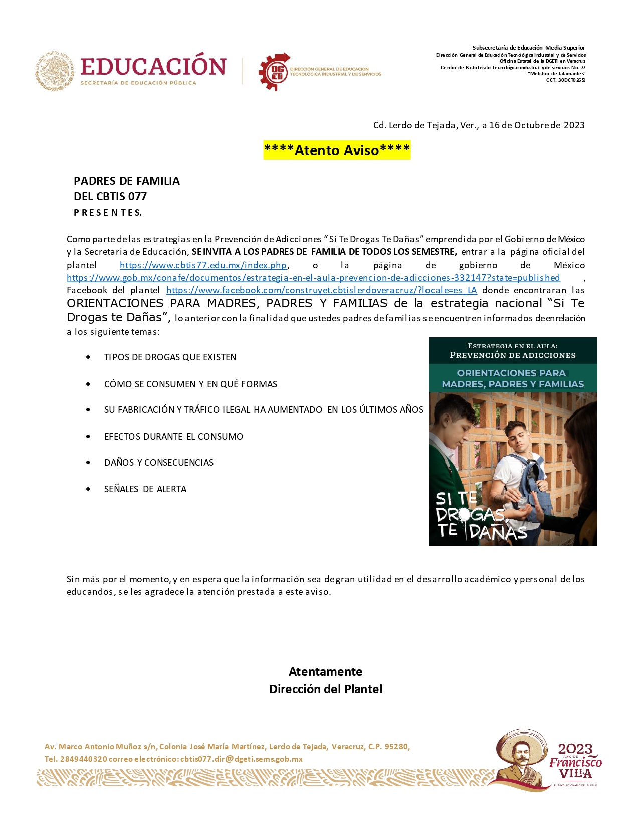 Como parte de las estrategias en la Prevención de Adicciones “ Si Te Drogas Te Dañas” emprendida por el Gobierno de México y la Secretaria de Educación, SE INVITA A LOS PADRES DE FAMILIA DE TODOS LOS SEMESTRE, entrar a la página oficial del plantel https://www.cbtis77.edu.mx/index.php, o la página de gobierno de México https://www.gob.mx/conafe/documentos/estrategia-en-el-aula-prevencion-de-adicciones-332147?state=published donde encontraran las ORIENTACIONES PARA MADRES, PADRES Y FAMILIAS de la estrategia nacional “Si Te Drogas te Dañas”, lo anterior con la finalidad que ustedes padres de familias se encuentren informados de en relación a los siguiente temas:
