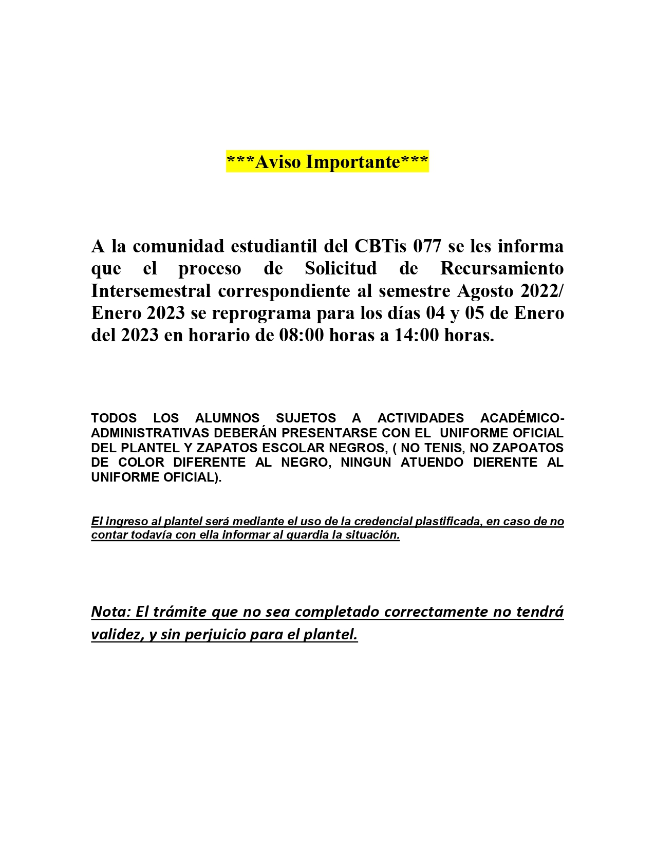 A la comunidad estudiantil del CBTis 077 se les informa que el proceso de Solicitud de Recursamiento Intersemestral correspondiente al semestre Agosto 2022/ Enero 2023 se reprograma para los días 04 y 05 de Enero del 2023 en horario de 08:00 horas a 14:00 horas.