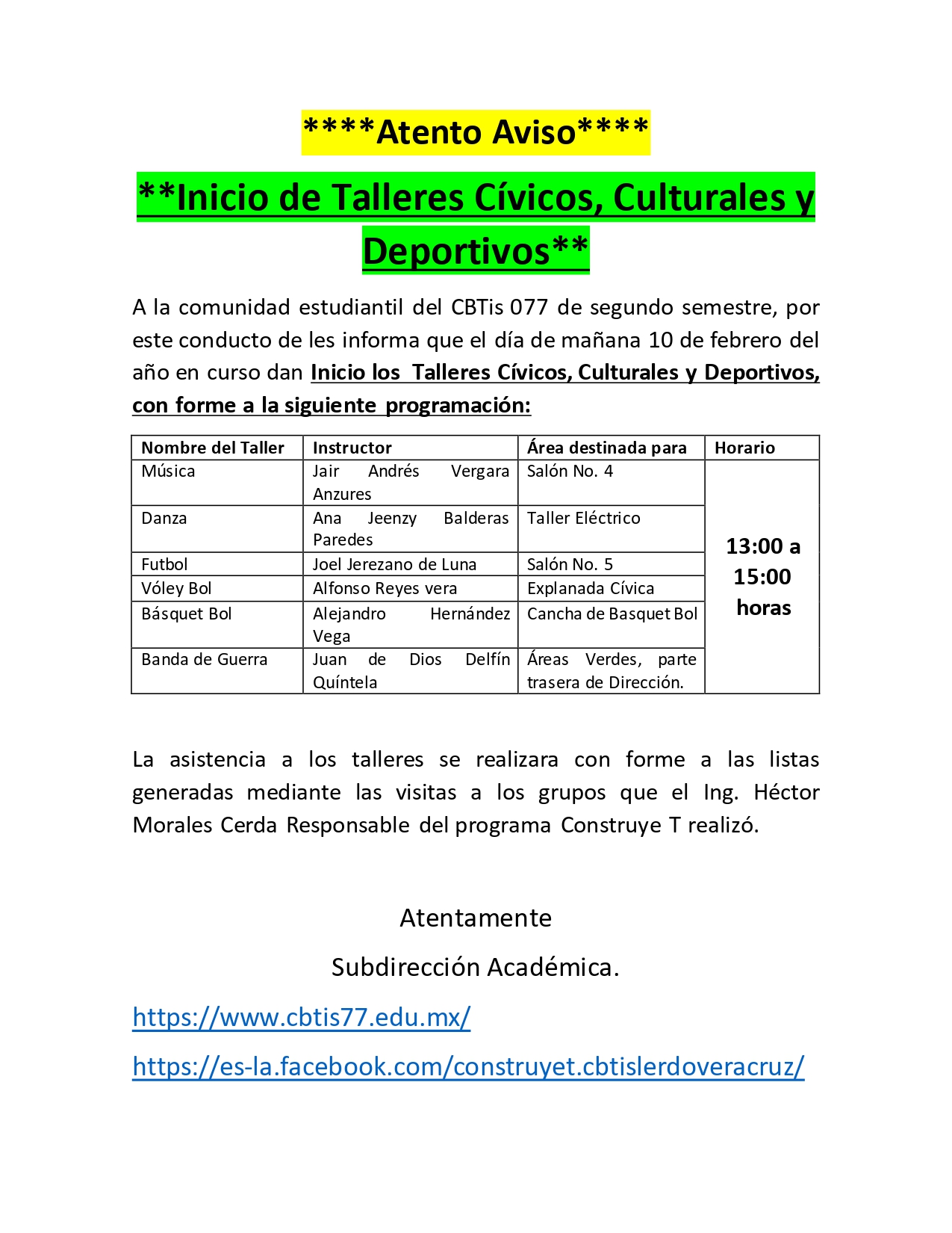 **Inicio de Talleres Cívicos, Culturales y Deportivos**