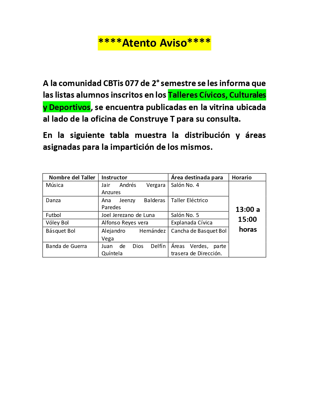 Listas alumnos inscritos en los Talleres Cívicos, Culturales y Deportivos
