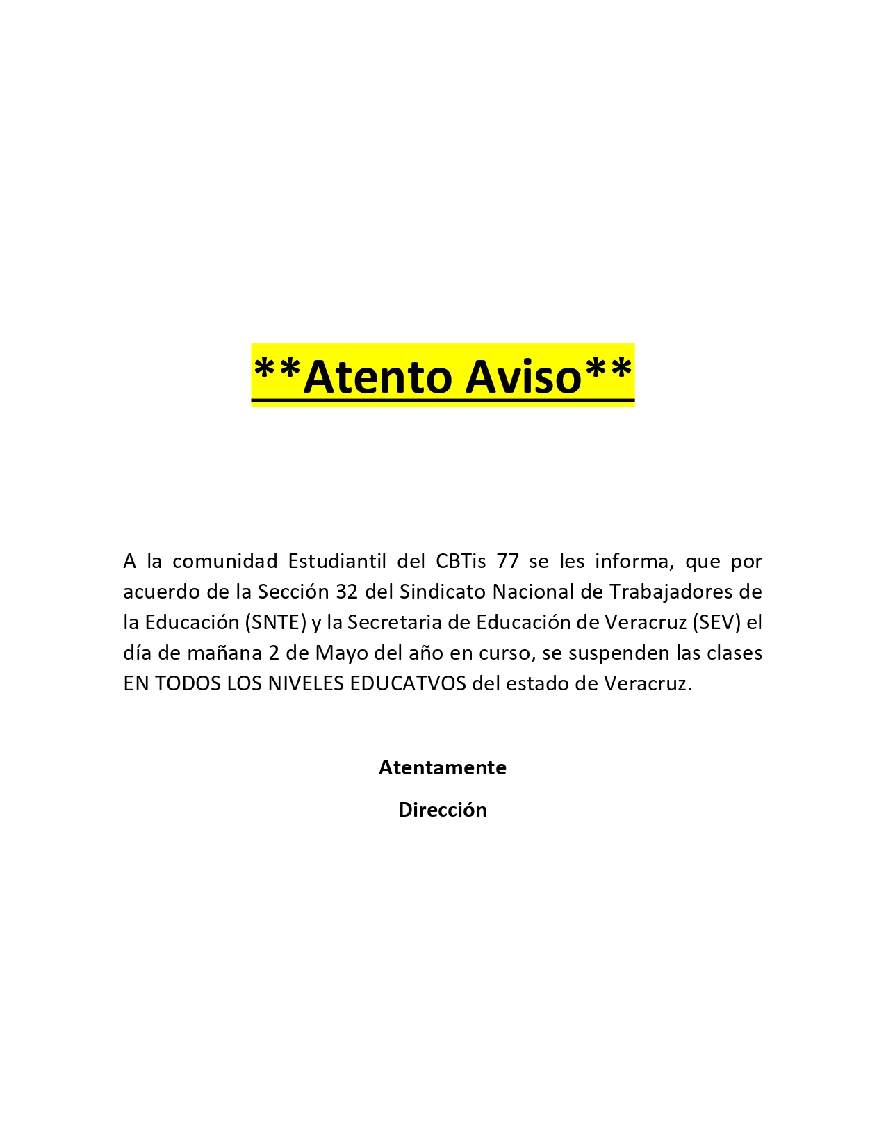 Por acuerdo SEV- SNTE se suspenden labores el dia 02 de Mayo de 2023