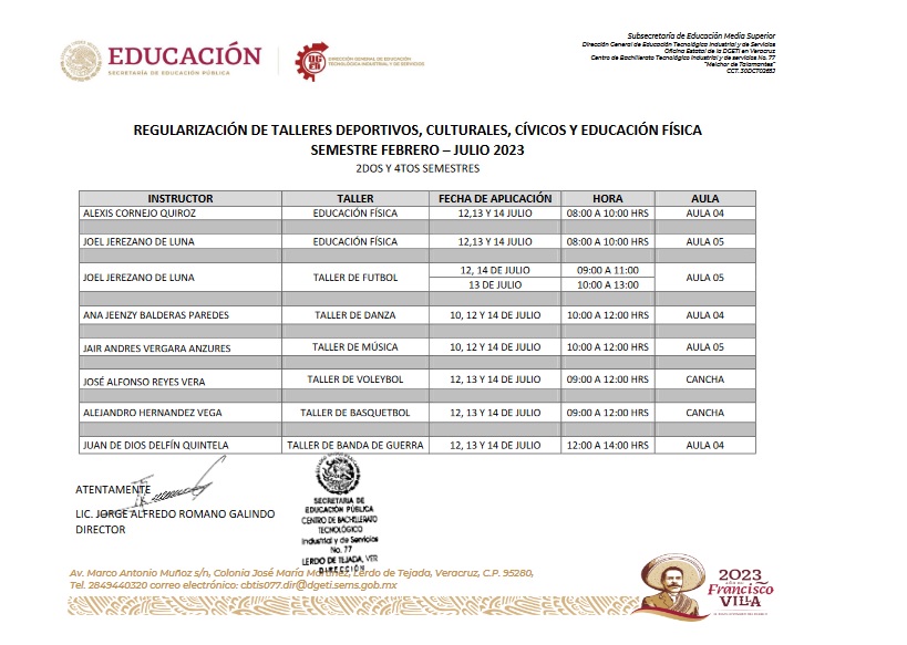 CALENDARIO DE REGULARIZACIÓN PARA TALLERES CULTURALES, DEPORTIVOS Y CIVICOS.