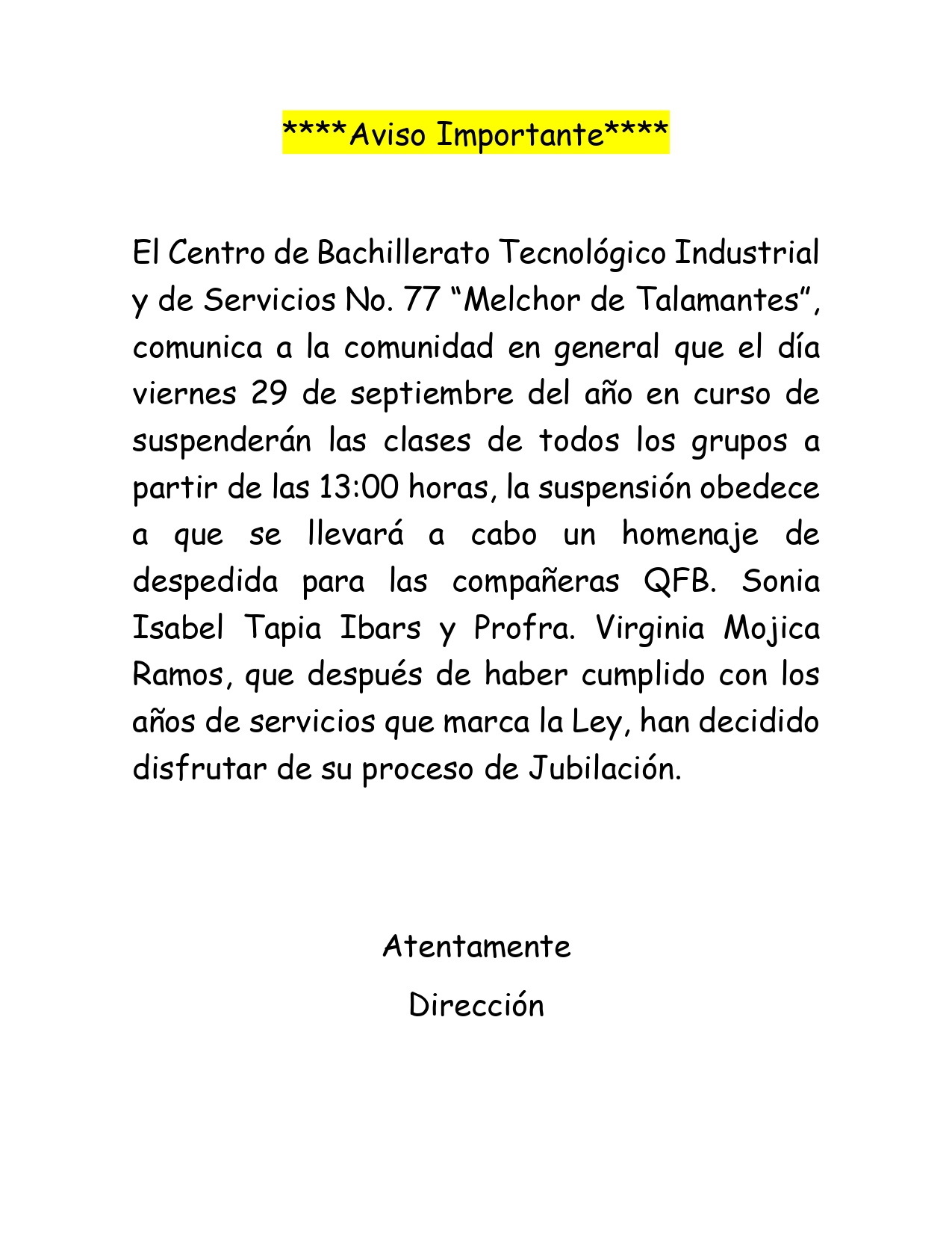 la suspensión obedece a que se llevará a cabo un homenaje de despedida para las compañeras QFB. Sonia Isabel Tapia Ibars y Profra. Virginia Mojica Ramos, que después de haber cumplido con los años de servicios que marca la Ley, han decidido disfrutar de su proceso de Jubilación.